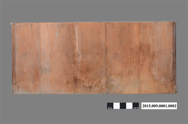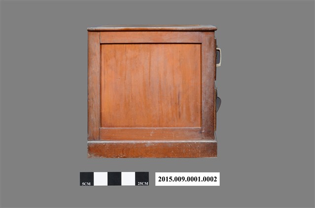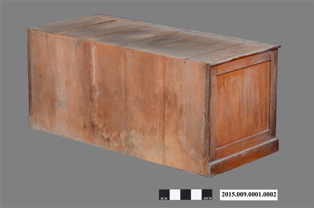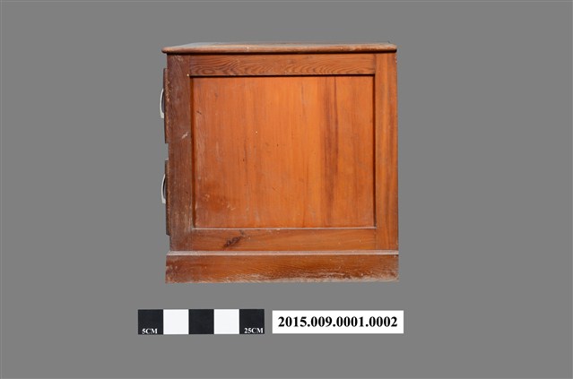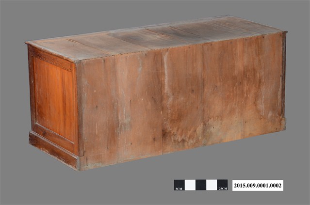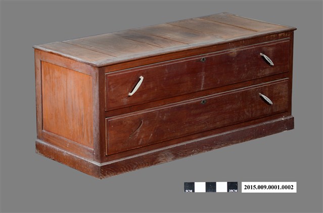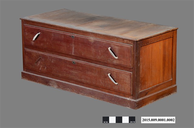 本件為木製4尺衣櫃之下櫃,高約1尺8寸,面寬4尺,有二層長抽屜,鐵件拉把為內斜45度角左右對稱,其中下層抽屜左側拉把損壞不見,改以鐵線修補替代。