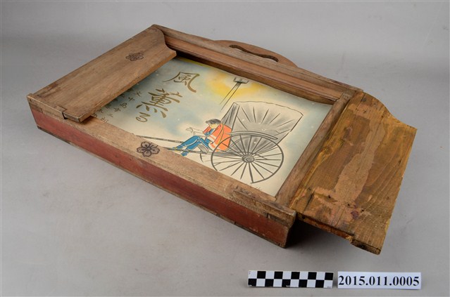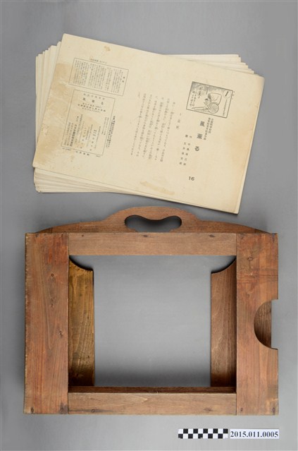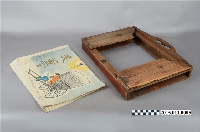 紙芝居故事說演,透過一個小木箱的舞台,抽換裡頭的故事圖片,搭配上說演者的聲音表情,讓故事更加生動、有趣。本文物是學校紙芝居故事圖片一套,共16張,放映者訂製一個放映的木箱,類似有提窗戶的型式,木箱上方有一個把手方便提拿,木箱下方及兩扇窗面上分別有櫻花的烙印。本故事圖繪由中島幸三郎著,玉井德太郎所繪,為紀念日露戰爭海軍記念日作品《風薰る》,共有16頁的圖畫。