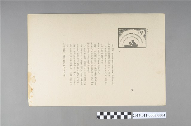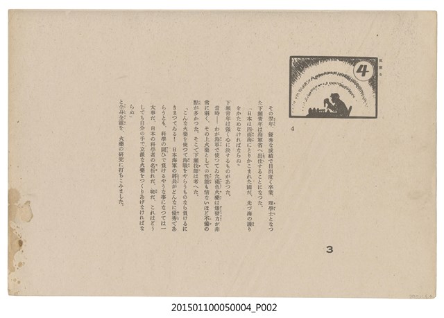 本故事為《風薰る》,由大日本話劇株式會社製作,昭和十九年七月十五日發行,故是作者為中島幸三郎,圖畫繪者為玉井德太郎,故事內容大致講述下瀨火藥的發明者--下瀨雅允,研發改良火藥的經過,進而將火藥用於日俄戰爭。此為故事第3頁。