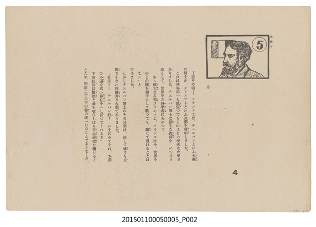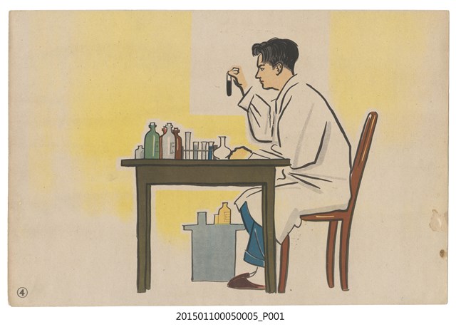 本故事為《風薰る》,由大日本話劇株式會社製作,昭和十九年七月十五日發行,故事作者為中島幸三郎,圖畫繪者為玉井德太郎,故事內容大致講述下瀨火藥的發明者--下瀨雅允,研發改良火藥的經過,進而將火藥用於日俄戰爭。此為故事第四頁。
