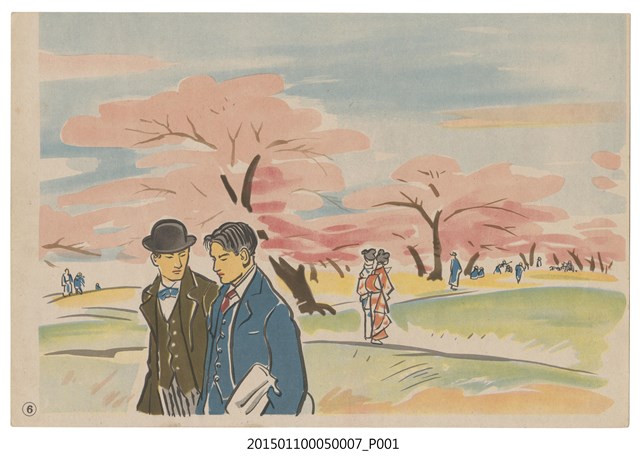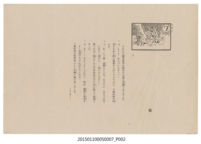 本故事為《風薰る》,由大日本話劇株式會社製作,昭和十九年七月十五日發行,故是作者為中島幸三郎,圖畫繪者為玉井德太郎,故事內容大致講述下瀨火藥的發明者--下瀨雅允,研發改良火藥的經過,進而將火藥用於日俄戰爭。此為故事第六頁。