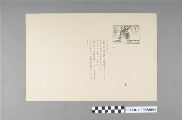 本故事為《風薰る》,由大日本話劇株式會社製作,昭和十九年七月十五日發行,故是作者為中島幸三郎,圖畫繪者為玉井德太郎,故事內容大致講述下瀨火藥的發明者--下瀨雅允,研發改良火藥的經過,進而將火藥用於日俄戰爭。此為故事第八頁。