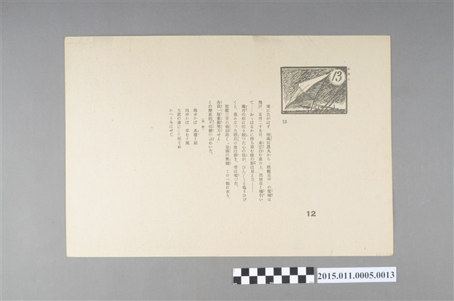 本故事為《風薰る》,由大日本話劇株式會社製作,昭和十九年七月十五日發行,故是作者為中島幸三郎,圖畫繪者為玉井德太郎,故事內容大致講述下瀨火藥的發明者--下瀨雅允,研發改良火藥的經過,進而將火藥用於日俄戰爭。此為故事第十二頁。