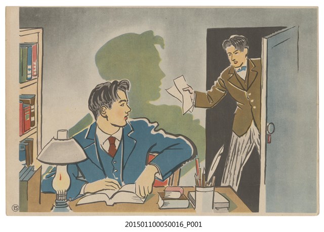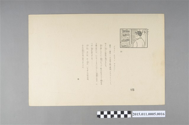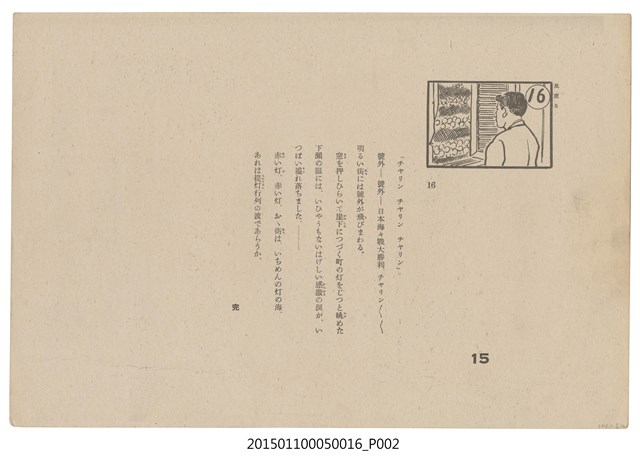 本故事為《風薰る》,由大日本話劇株式會社製作,昭和十九年七月十五日發行,故是作者為中島幸三郎,圖畫繪者為玉井德太郎,故事內容大致講述下瀨火藥的發明者--下瀨雅允,研發改良火藥的經過,進而將火藥用於日俄戰爭。此為故事第十五頁。
