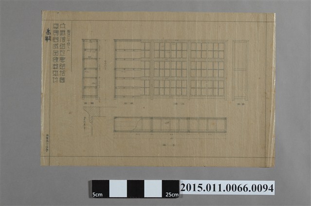 臺灣總督府專賣局全島各種設計圖原稿,本文件是高雄專賣局物品倉庫取付戶棚新設工事設計圖。