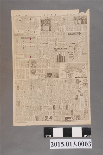 本物件為民國42年6月19日《中央日報》第5、6版,除了報導台灣各地的時事外,第6版內容為台灣糖業的專題報導,為台灣糖業的現況進行地圖、統計數據的分析與比較,反映出戰後初期糖業的現況。本件正可以作為戰後初期社會時事的資料,也反映出戰後報刊的風格與特色。
