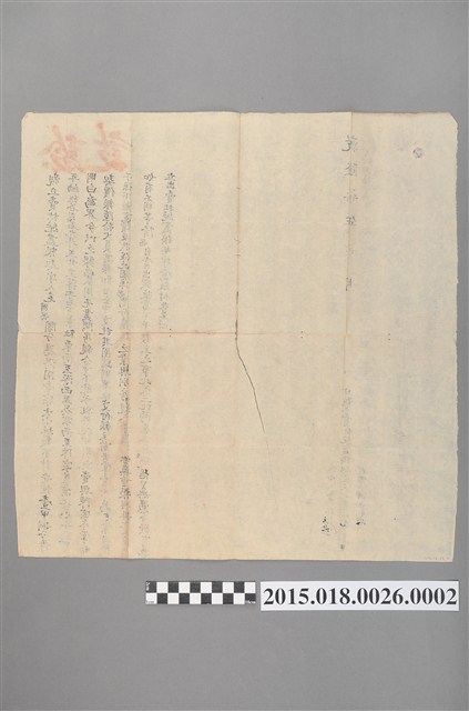 本件契約,為7年7月,陳文宗等五房,買毛國器之許中營下寮社東土地,共價銀60大圓。契約有破損。右上方有「驗訖」紅色二字。