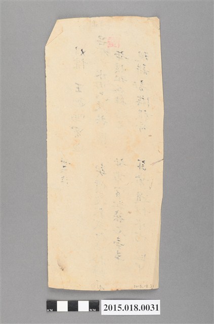 本張紙質契約為清代臺灣田業宗卷買賣摘要浮籤,上蓋有「陸」紅色字樣,可與同批文物之印章配合對峙。內容記載王遜鳴向呂天生、呂聲宏購買水田六段,共1甲3分6厘,及交易金額及土地繳納官租數額等。品項完好,略有折痕。