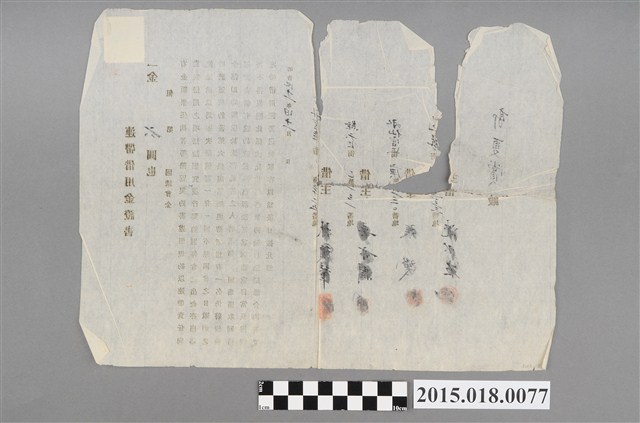 明治41年11月,林顏輦等連帶借用金證書,林顏輦等人向郭夏賞借六圓,依照日本時代制式表格填寫,右上角貼有一錢印花。