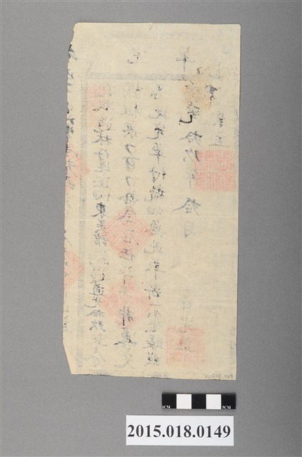 清代墾戶業主發給佃戶的繳租證明或商人買賣銀貨兩訖的收據,稱為完單。完單多以版印印刷基本格式,一張完單左右兩邊同樣印製交易或往來事項、日期。本件為榮春家給東美館之完單。