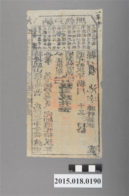 此為道光19年8月,蘇儀完納正供栗9斗9升,鳳山縣知縣曹謹發給之納戶執照。紙背右上書有「一峯亭」3字。