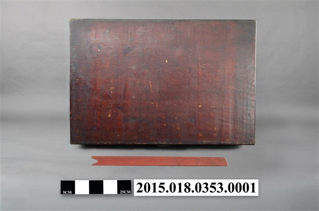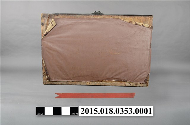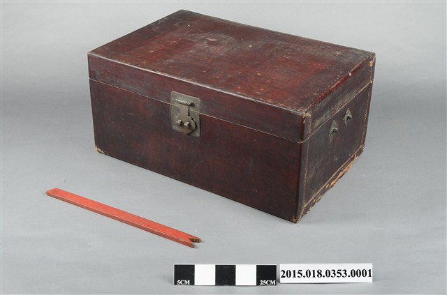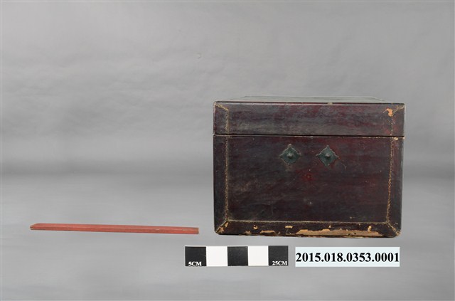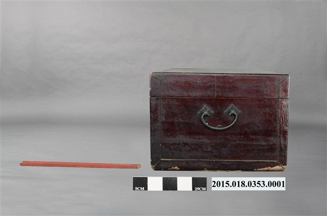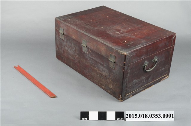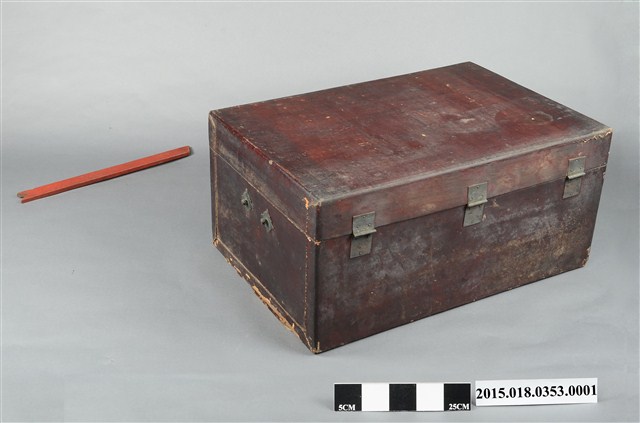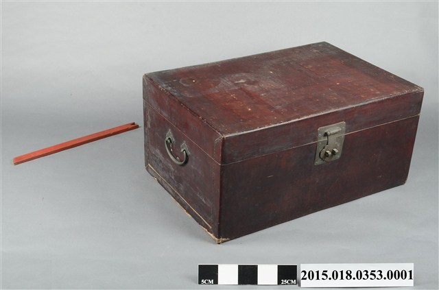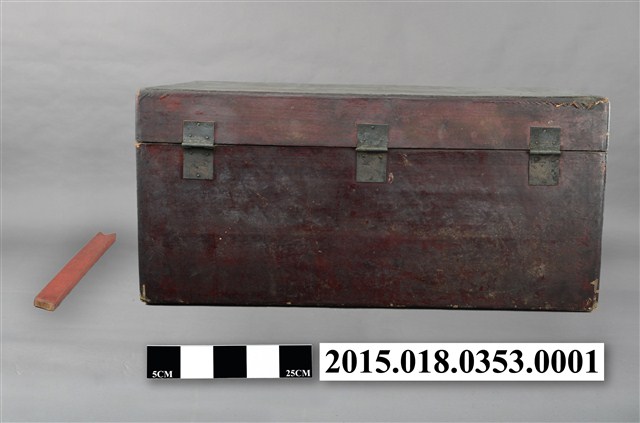 清代衣物箱一組,除衣箱本體外另有一根支架及一副銅製鎖頭。