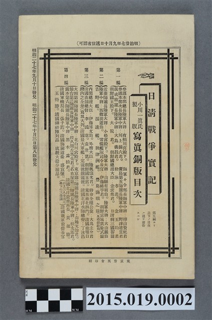 本編為此系列之第2編,本版為8版,第1-20編封面皆相同。每月發行三回,費用為1錢5厘。專欄有:口繪(圖版)、本紀、史傳、文苑、內外彙報(日本、支那、朝鮮、日誌)。支那部分有提及劉永福及臺灣之防禦。