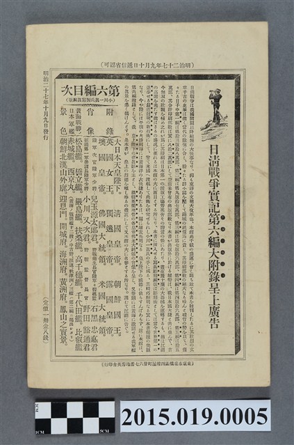 本編為此系列之第5編,本版為初版。每月發行三回,費用為1錢5厘,第1-20編封面皆相同。封面預告第6編(10月17日發售,將附上絕美的大附錄。專欄有:口繪(圖版)、本紀、豐公朝鮮軍記、史傳、地理、文苑、內外彙報(日本、支那、朝鮮、局外國。本紀有黃海海戰戰況,史傳有聯合艦隊司令長官伊東祐亨傳