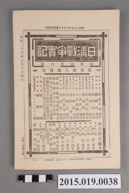 本編為此系列之第38編,本版為初版。每月發行三回,費用為1錢5厘,第21-50編封面皆相同。封面有:文字簡明,敘事精確的征清戰史本編開始揭載。內容有:口繪(圖版)、戰爭實記(尖筆山攻擊、臺北保良局開設、臺灣近況)、勳功美談、戰爭文學、東洋風土(蘇澳灣地誌、臺地雜?、臺灣的異事)、外交史談、海外戰史、軍事叢談、軍人餘譚、戰後經濟、海外評論、國論一斑、海外時事、海內時事、征清戰史。