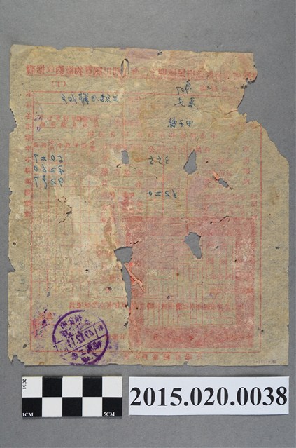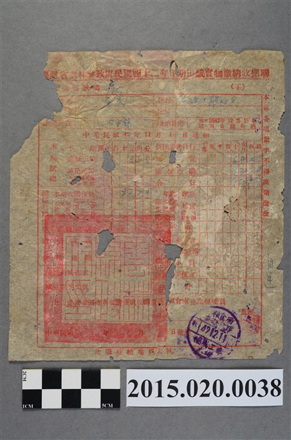 2015.020.0038 臺灣省雲林縣政府給唐文田賦實物繳納收據聯