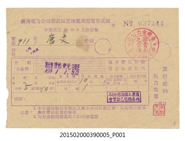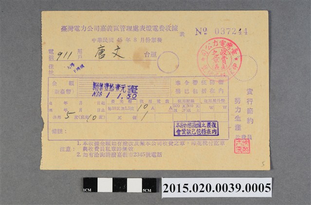 2015.020.0039.0005 臺灣電力公司嘉義區管理處給用戶唐文電費收據No.037244