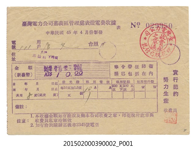 民國45年4月臺灣電力公司嘉義區管理處給用戶唐文電費收據。