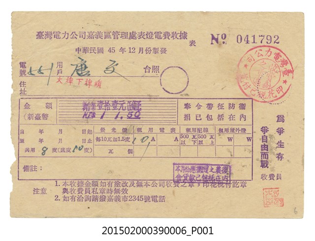 臺灣電力公司嘉義區管理處給用戶唐文電費收據No.041792