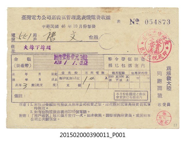 民國46年10月臺灣電力公司嘉義區管理處給用戶唐文電費收據