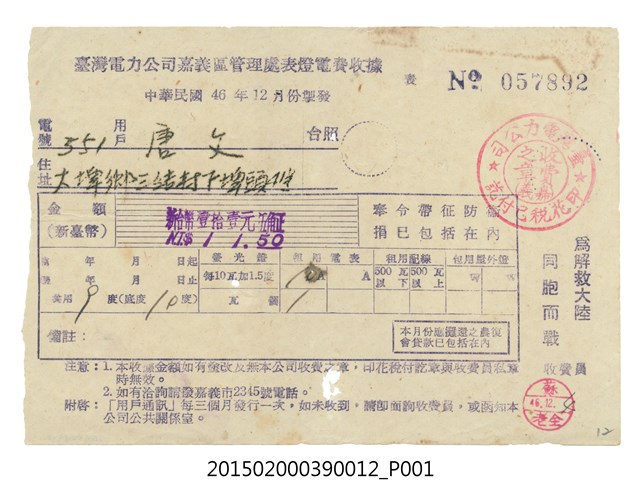 臺灣電力公司嘉義區管理處給用戶唐文電費收據No.057892