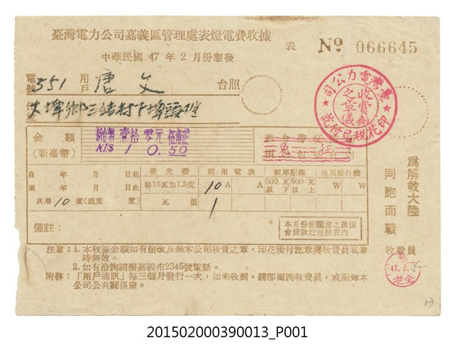2015.020.0039.0013 臺灣電力公司嘉義區管理處給用戶唐文電費收據No.066645