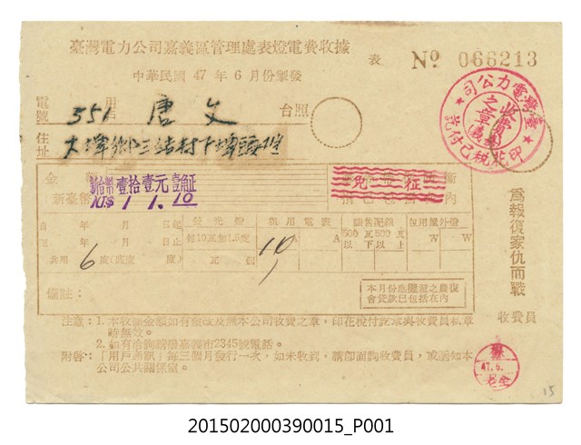 民國47年6月臺灣電力公司嘉義區管理處給用戶唐文電費收據
