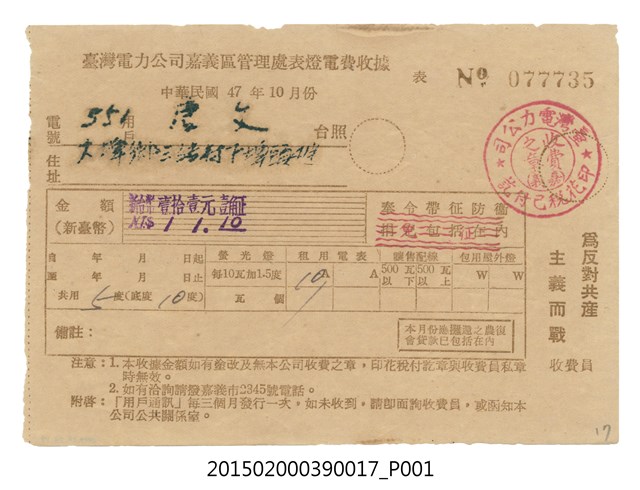 臺灣電力公司嘉義區管理處給用戶唐文電費收據No.077735