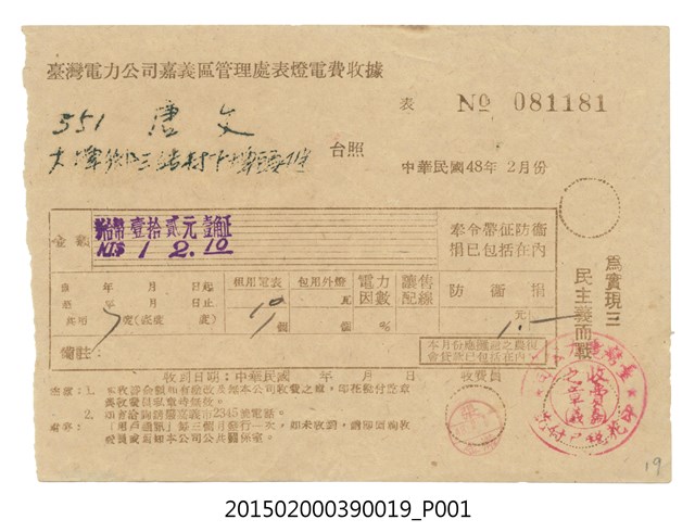 臺灣電力公司嘉義區管理處給用戶唐文電費收據No.081181