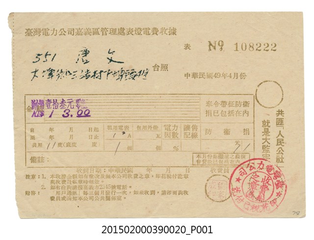 臺灣電力公司嘉義區管理處給用戶唐文電費收據No.108222