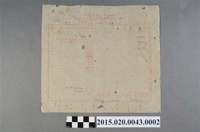 民國47年12月23日雲林縣大埤鄉農會給申請者唐文稻穀申請檢驗秤量單(代入倉通知單)。