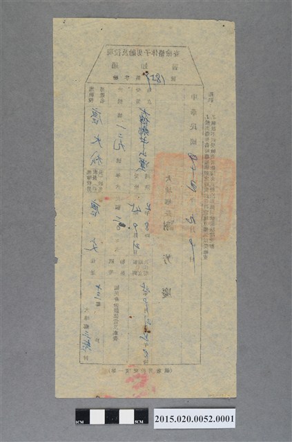 民國45年9月9日發給唐大松的現役及齡男子體格檢查通知書。