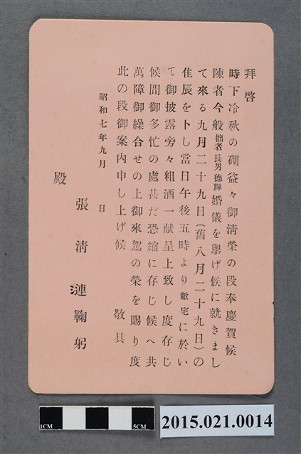 2015.021.0014 昭和7年9月張清漣之子張德輝結婚婚宴邀請卡