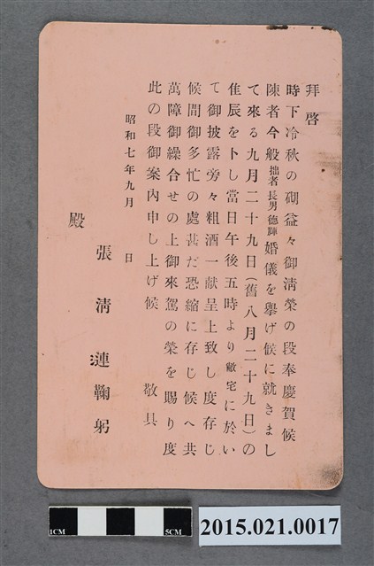 2015.021.0017 昭和7年9月張清漣之子張德輝結婚婚宴邀請卡