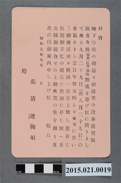 2015.021.0019 昭和7年9月張清漣之子張德輝結婚婚宴邀請卡
