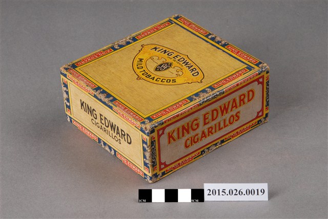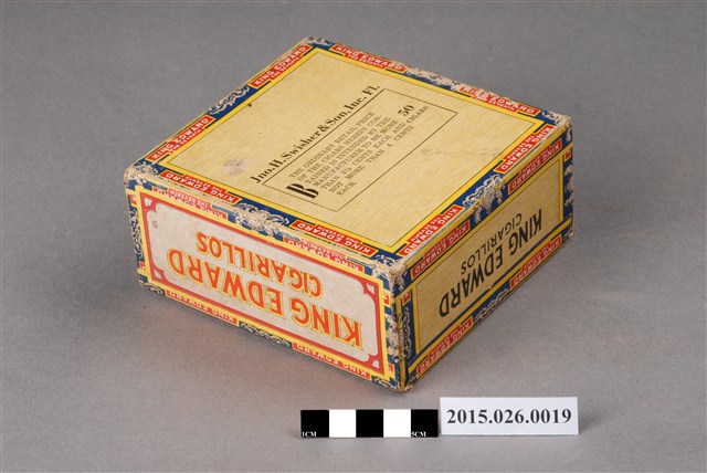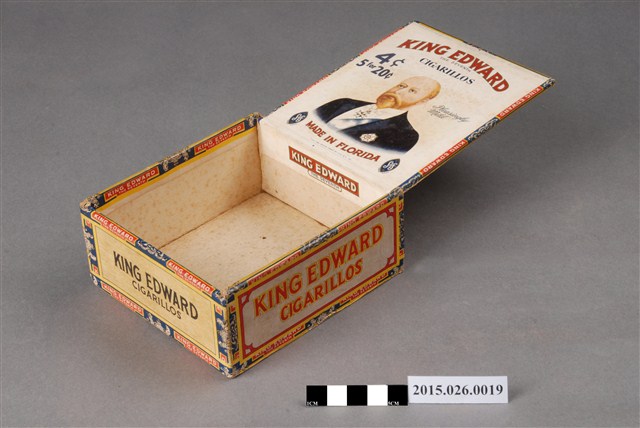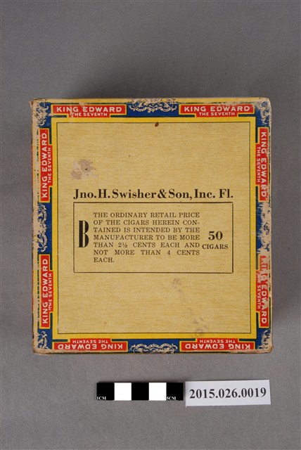 2. 本雪茄盒為愛德華國王牌雪茄,為美國佛羅里達州Jno. H. Swisher & Son, Inc. 出品。四方型厚紙盒,內外貼覆彩色印刷包裝紙。盒蓋正面中央有一徽章標誌,上有「KING EDWARD THE SEVENTH、S&S(雪茄公司商標)、MILD TABACCOS」等字。外盒側邊均印有「KING EDWARD CIGARILLOS」字樣。盒底為製造公司「Jno. H. Swisher & Son, Inc. Fl.」、內容50支標示及雪茄販售價格建議說明文字。盒內頂蓋中央有愛德華國王(KING EDWARD )的半身肖像,左上方標示每支美金4 分(cent),5支20分,底邊標示MADE IN FLORIDA。