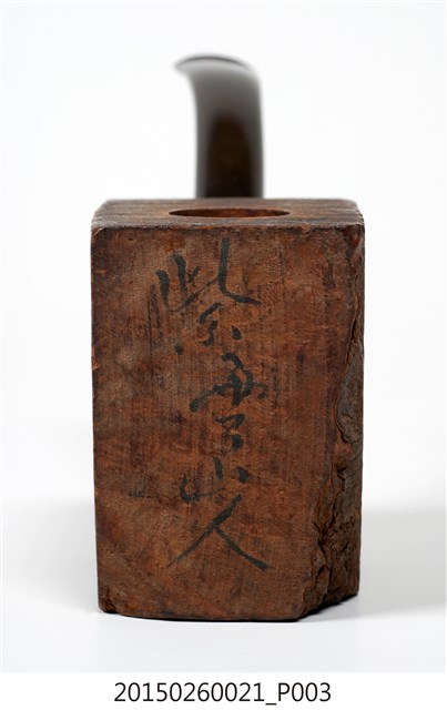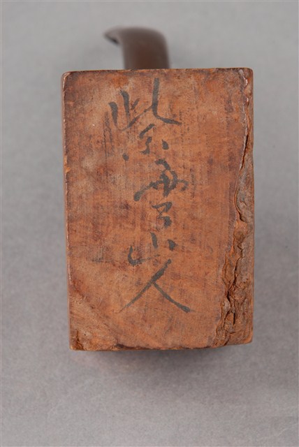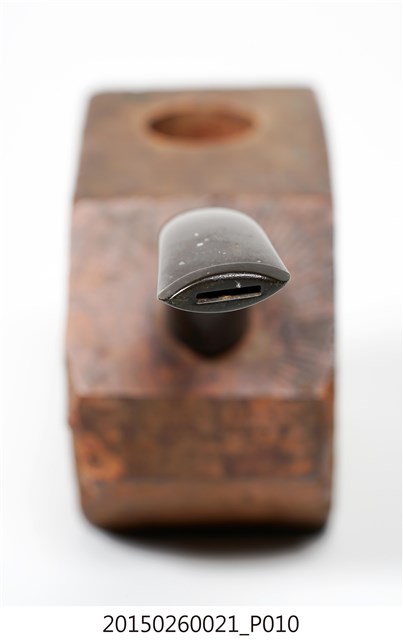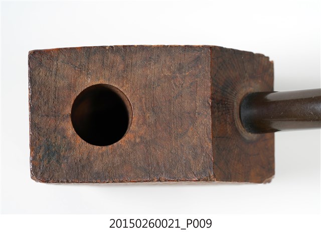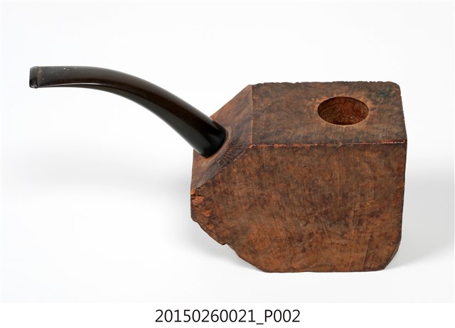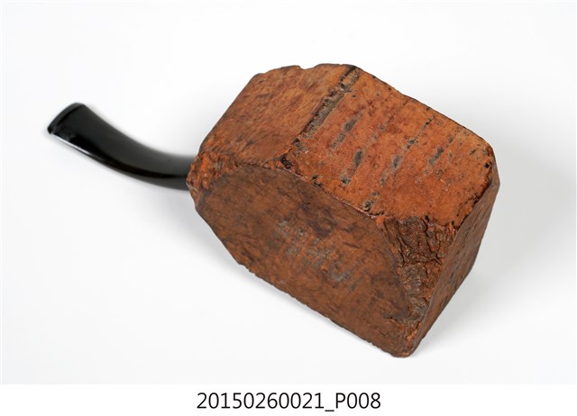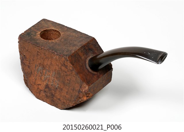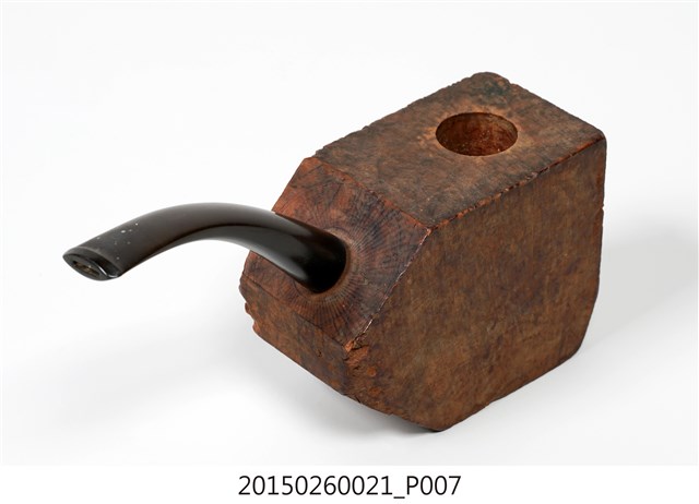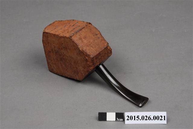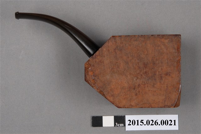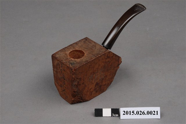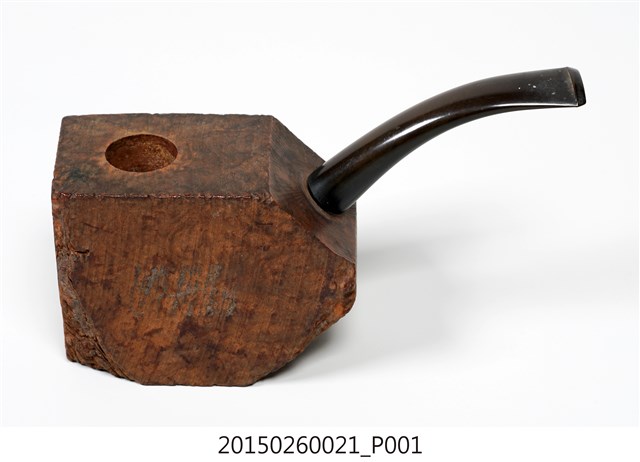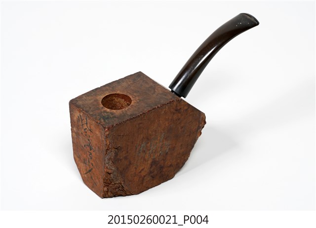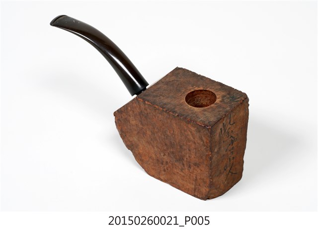 1. 本件為「臺灣攝影獨行俠」黃則修先生(1930-2014)自製菸斗,五角形木塊為斗身,一頭連接黑色塑膠彎式斗莖。斗身木塊上方挖一圓孔,用以填充煙草,斗身前側寫有「紫雲山人」四字毛筆字。此件煙斗由於斗身與斗莖間無連接氣孔,基本上無法抽吸,斗身內壁亦無煙草燒灼痕跡,推測是黃則修先生生前以國外煙斗廠所出的煙斗DIY半成品,自行雕塑、研磨、上色。