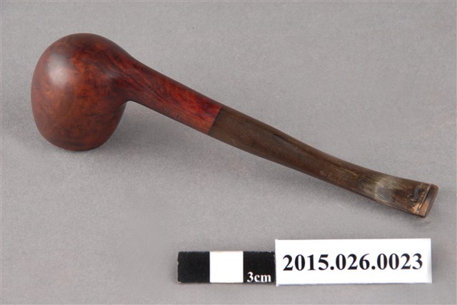 本件為「臺灣攝影獨行俠」黃則修先生(1930-2014)所使用過之煙斗,使用年代不詳。就造型上屬加拿大型直式煙斗(Canadian Pipe),煙斗分斗身、斗莖兩個部分:斗身以褐色木塊雕刻而成,斗碗略微圓胖狀,器表磨製圓滑,斗口內壁有燒灼黑漬,斗柄側邊印有「LONDON ENGLAND 1206」等小字。斗莖顏色與斗身相近,為深褐色塑膠材質,愈靠近吸嘴處愈顯扁平。