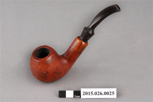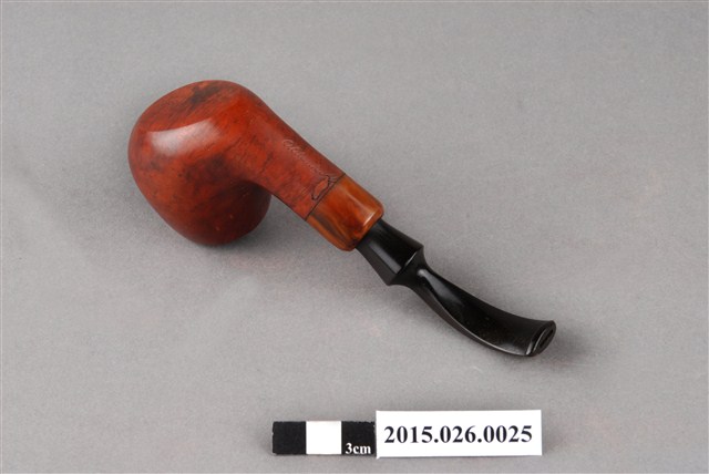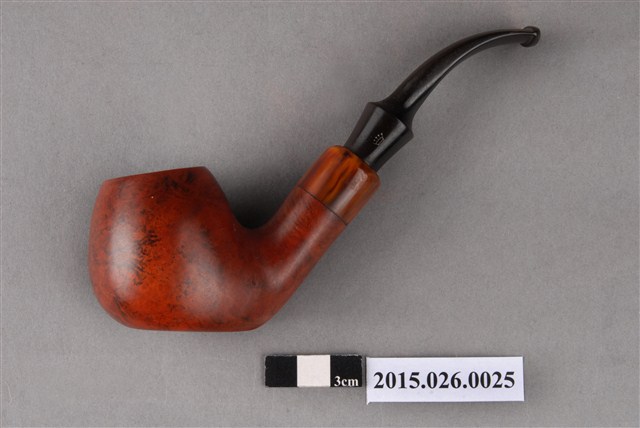 本件為「臺灣攝影獨行俠」黃則修先生(1930-2014)所使用過之煙斗,使用年代不詳。就造型上屬蘋果型彎式煙斗(Apple Pipe),煙斗分斗身、斗莖兩個部分:斗身以紅褐色木塊雕刻而成,斗碗圓胖為其特徵,器表磨製光滑可見木質紋理,煙斗內壁有輕微燒灼痕,斗柄彎曲角度大約45度,連接斗莖處一段以另一略淺色之木質接合;斗莖為黑色塑膠材質,與斗炳相連處徑較粗,吸嘴處呈扁平狀。