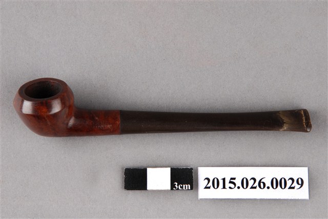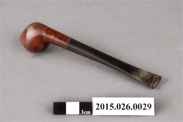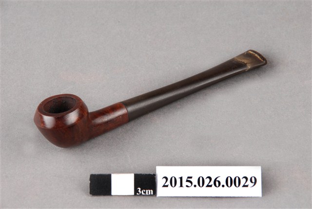 本件為「臺灣攝影獨行俠」黃則修先生(1930-2014)所使用過之煙斗,使用年代不詳。就造型上屬鍋盆型直式煙斗(Pot Pipe),煙斗分成斗身與斗莖兩個部分:斗身呈L型,以紅褐色木塊雕刻而成,斗碗與斗柄一體成型,斗碗呈淺盆狀,表面光滑,斗柄長度約佔煙斗全長1/2。斗莖為褐色塑膠材質,長度約佔煙斗1/2長,尾端吸嘴呈扁平狀。
