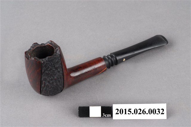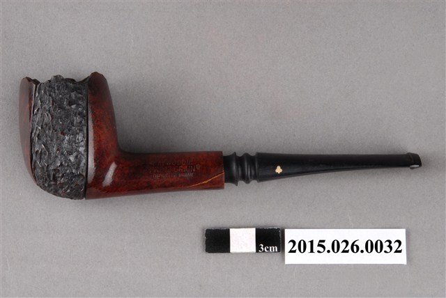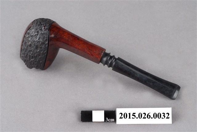 本件為「臺灣攝影獨行俠」黃則修先生(1930-2014)所使用過之煙斗,使用年代不詳。就造型上屬撞球桿型直式煙斗(Billard Pipe),煙斗分斗身與斗莖兩個部分:斗身呈L型,以紅褐色木塊雕刻而成,器表磨製光滑,斗碗中央鑲嵌一段粗糙的黑色木片,斗口呈不規則狀,斗柄彎曲角度呈約90度,長度約佔煙斗1/2長,側邊有印字「? リンR」。斗莖為黑褐色塑膠材質,長度約佔煙斗1/2長,與斗炳連接處有3段明顯凹缺轉折,尾端吸嘴呈扁平狀。