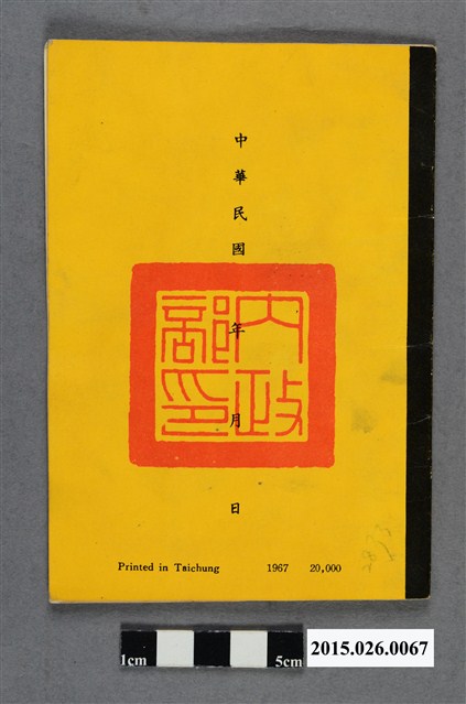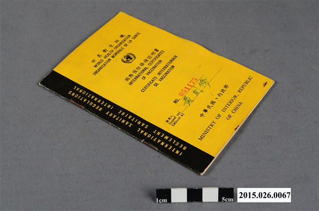 2. 早期臺灣出國必備證明文件除護照之外,有時還必須加上「國際預防接種證明書」,由於封皮為黃色,民間俗稱「黃皮書」,以便與綠色封皮的護照區隔。國際預防接種證明書為各國通用。在1973年以前,世界衛生組織對從事國際旅遊人士,規定必須持有霍亂預防接種證明書,後來因為霍亂預防接種成效不彰而刪除此項。本件為1967年內政部印製與核發之國際預防接種證明書,當時出國前需施打的疫苗包括天花、霍亂、黃熱病等預防接種。不同時期要求出國的預防接種項目,隨著各地區防疫政策與衛生狀況而有所不同,目前還是有黃皮書,惟現今世界衛生組織實際規定之國際旅遊必須進行之預防接種只有黃熱病一項。