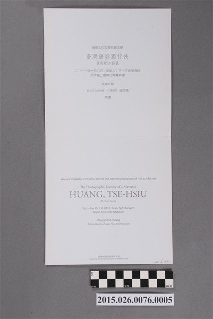 本件為臺北市立美術館「臺灣攝影獨行俠─黃則修82影展」特展邀請卡,正方形卡片,正面為黑白印刷,使用黃則修野柳系列作品中最為著名拍攝野柳特殊地質景觀─蠟燭石之黑白照片為背景,卡片背面為金黃色封底。內容文字採中英文對照,主要為北美館代理館長翁誌聰邀請參加2011年10月8日下午3-5時之特展開幕典禮。