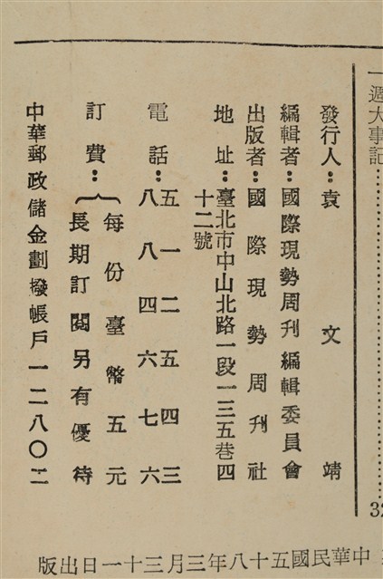 此雜誌為戒嚴時期的報導國際現勢之周刊。封面為馬康衛大使夫人在臺北崇她社演說。內容有尼克森、越南問題、反彈道飛彈之論戰,美國會通過核子擴散條約等。