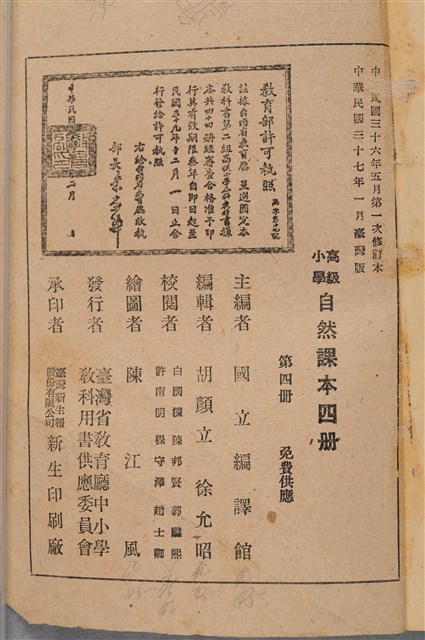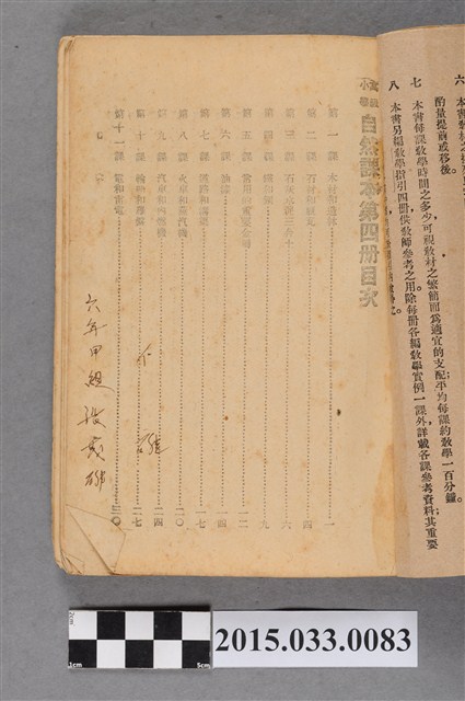 本版內容有第1課木材和造林到第11課電和雷電。內有六年甲組張OO簽名,背面有臺灣新生印刷廠圖樣(陳亭靜撰文,陳怡宏校正)