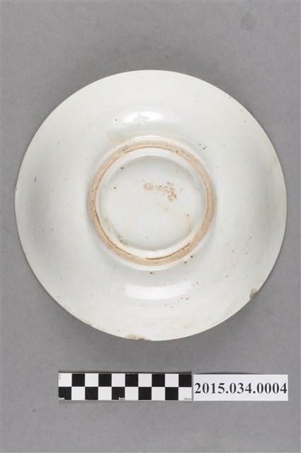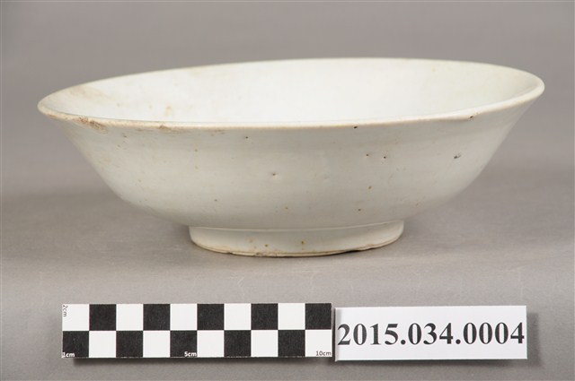 本件為捐贈者母親林凉女士戰後初期於臺南市開設自助餐小吃部時店內用的中型陶瓷湯碗或麵碗。湯碗以白釉為底,碗內壁噴水藍色釉料,留白處形成白色雙鶴紋,一隻呈飛翔狀,另一隻呈站立狀。碗口緣略有使用造成之缺刻,器底帶一矮圈足。