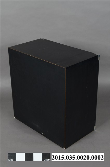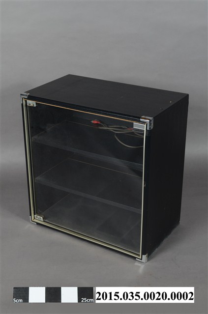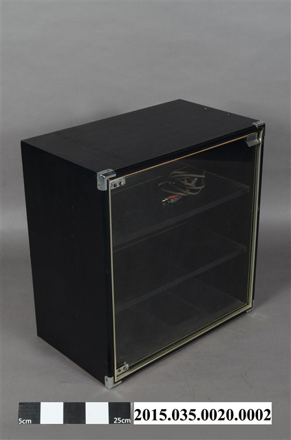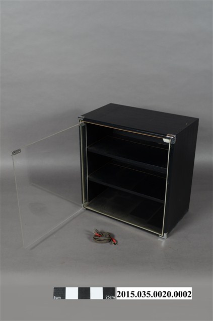 海頓牌JY-7517百分伴唱機錄音帶收納櫃,黑色、四方形木櫃,前方附透明玻璃門,內有兩層隔板,可放置三層卡帶或匣帶。