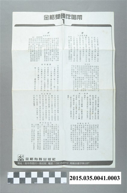 2015.035.0041.0003 金格有聲出版社發行國語GJ-6014《金格音聲多重伴唱帶11》匣式錄音帶歌詞