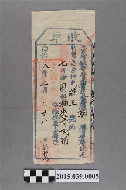 2015.039.0005 同治8年城守營竹塹隆恩息庄交付佃人莊三收單