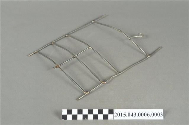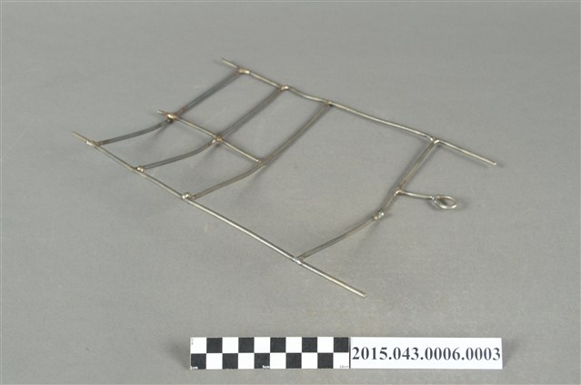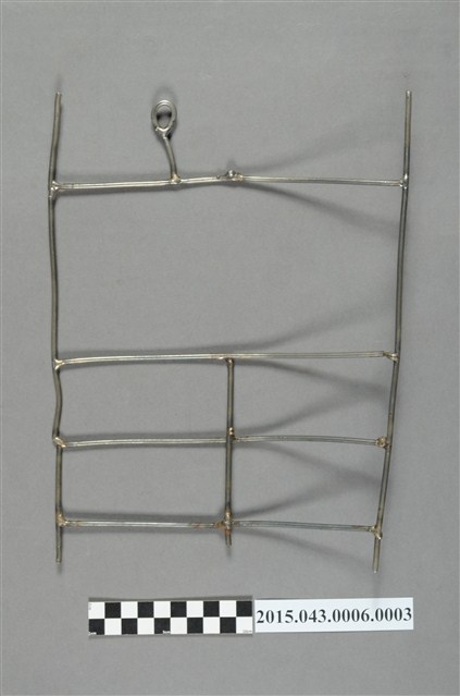 小型底片沖洗吊掛架,金屬材質,頂部有一圓圈形提把,上半部區域鏤空,可用來吊掛大片底片,近底部為四方格狀,可用來吊掛小片底片。本吊掛架適合放入硬橡膠沖片筒之橫向溝槽。